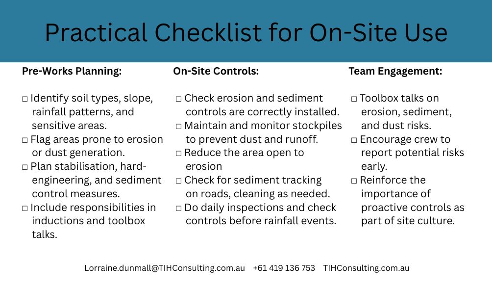 - Pre-planning is critical: Identify soil structure, potential erosion, dust, and runoff risks before works start.